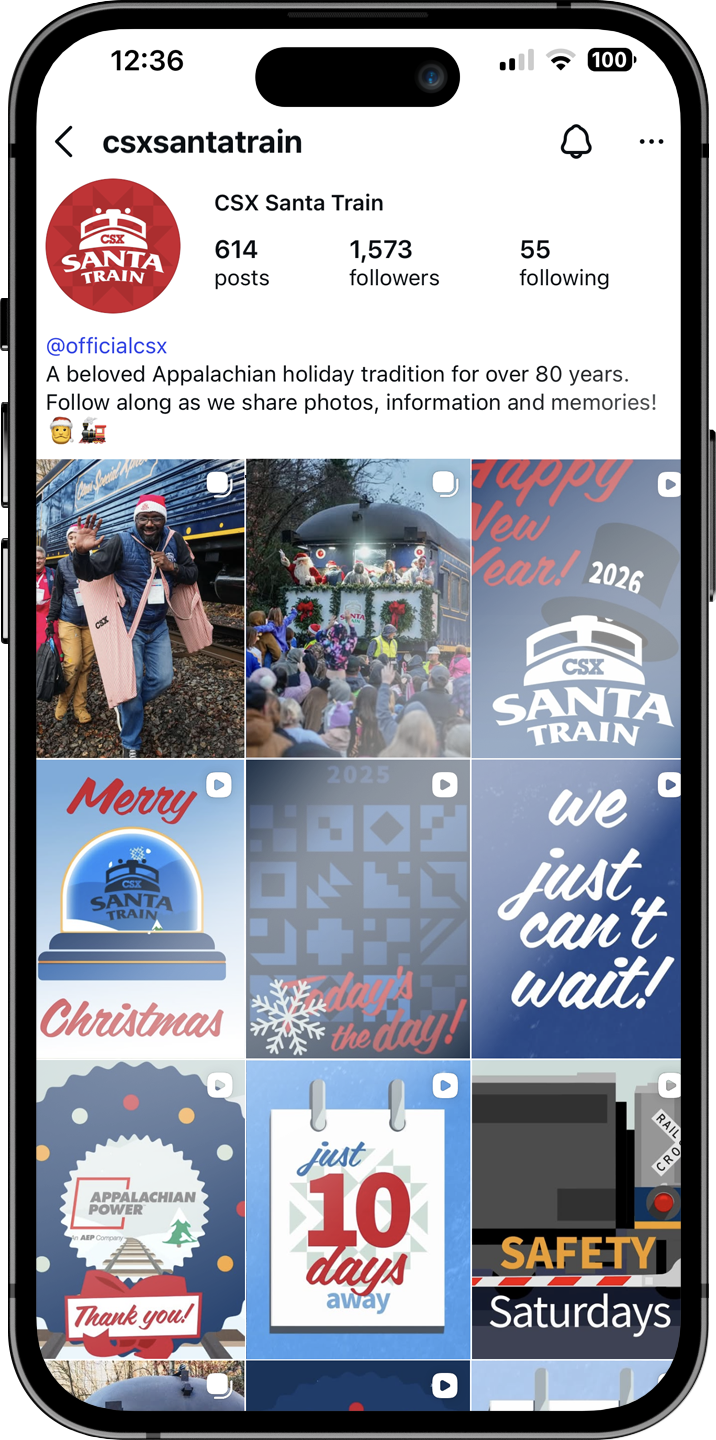 An annual charitable event seeking to improve its promotional reach and effectiveness among attendees and donors. In addition to static posts on Instagram and Facebook, thirteen short animated videos were added for the annual social media campaign for the 2025 Santa Train.